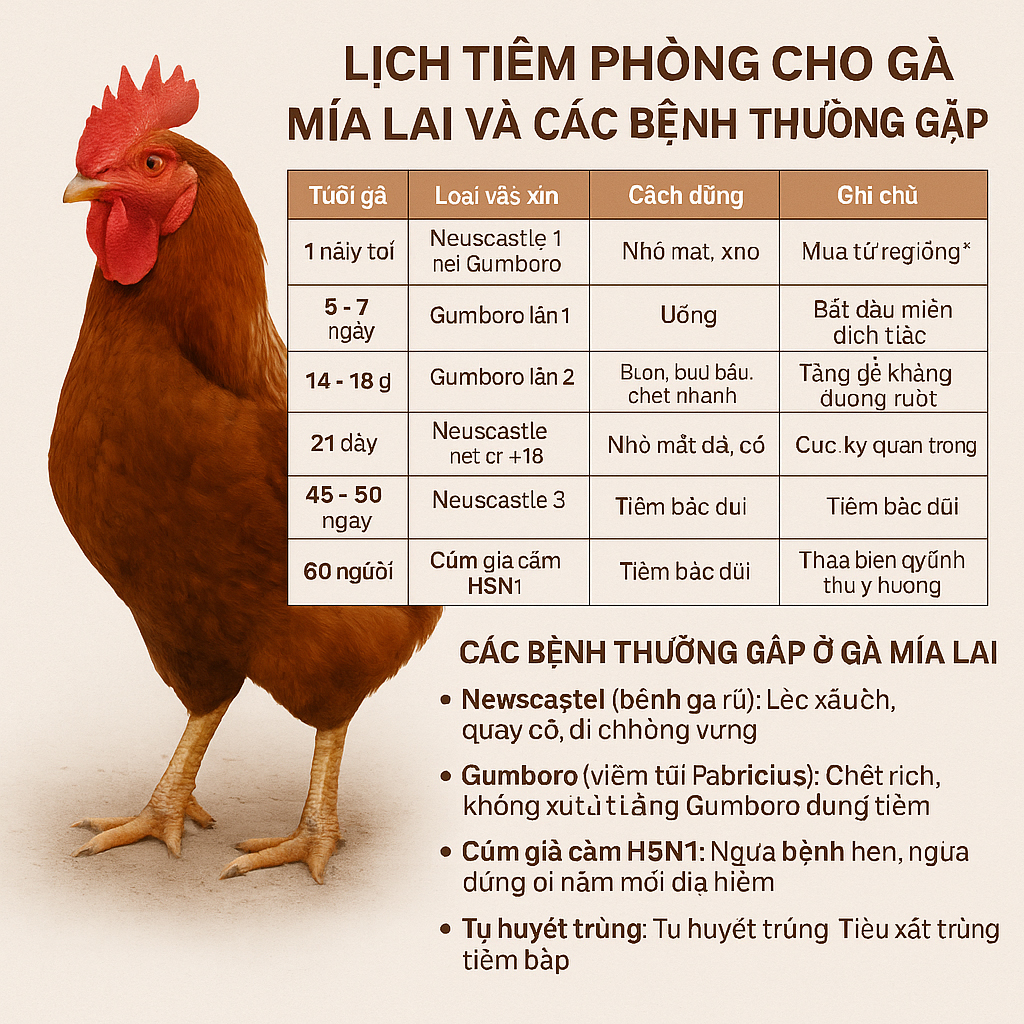 Lịch tiêm phòng cho gà mía lai theo từng giai đoạn.